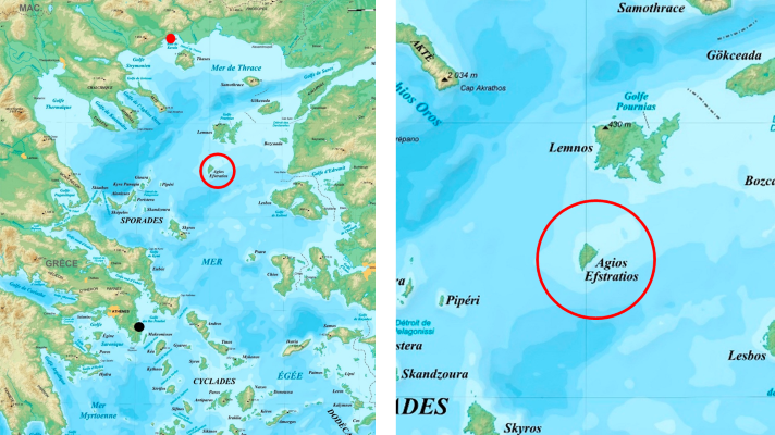 Η Ν. Άγιος Ευστράτιος είναι το τρίτο και μικρότερο νησί της Περιφερειακής Ενότητας Λήμνου. Από την προς Βορρά Ν. Λήμνο απέχει 19 ναυτικά μίλια. Το έδαφός του νησιού είναι λοφώδες με ενιαία κορυφογραμμή κατά μήκος βορρά-νότου, εκατέρωθεν της οποίας σχηματίζονται δευτερογενείς λοφοσειρές με ενδιάμεσες κοιλάδες που καταλήγουν στη θάλασσα. Οι υψηλότερες κορυφές είναι το Σημάδι (298 μ) και η Λεμονή Ράχη (288 μ). Η μεγαλύτερη πεδινή έκταση βρίσκεται στη θέση όπου είναι χτισμένος σήμερα ο οικισμός, κάτω από το λόφο του Αγίου Μηνά.